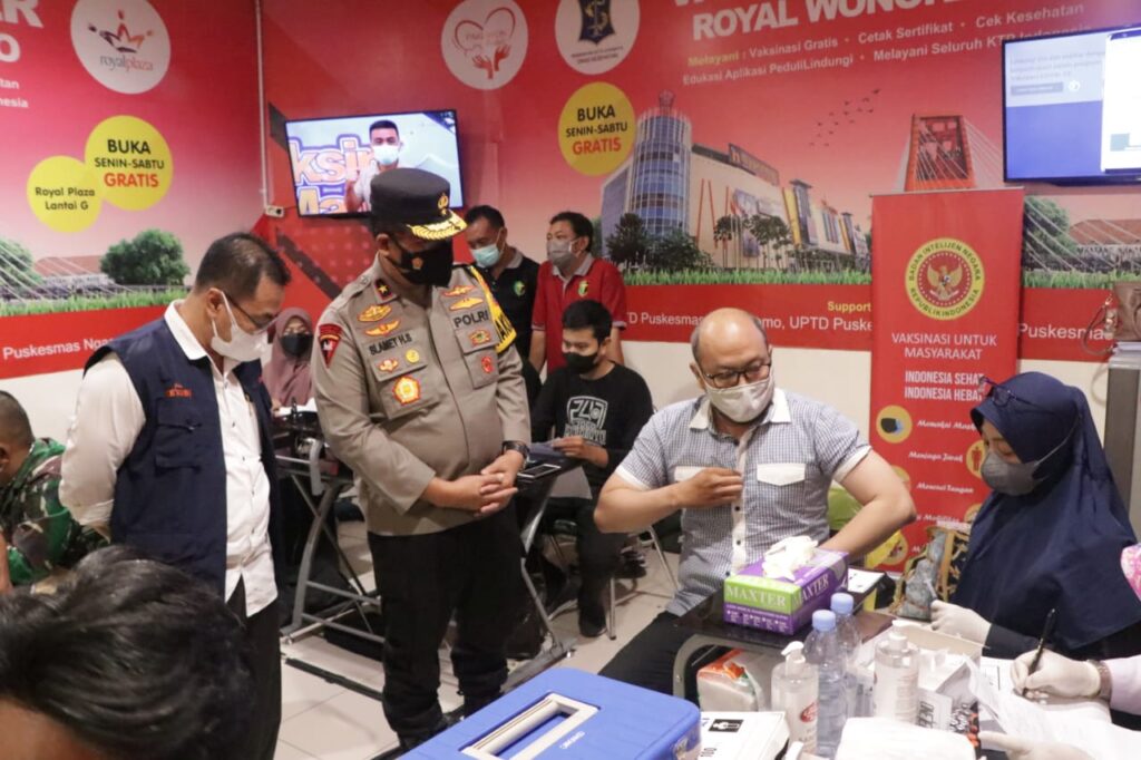 Wakapolda Jatim bersama Pejabat Utama Polda Jatim dan di dampingi Ketua Satgas Kuratif Covid-19 Jatim, Danrem 084/Bhaskara Jaya, Wakapolrestabes Surabaya, secara langsung melakukan pengecekan vaksinasi yang berlangsung di Royal Plaza Surabaya, dengan sasaran target masyarakat umum sebanyak 150 dosis.
