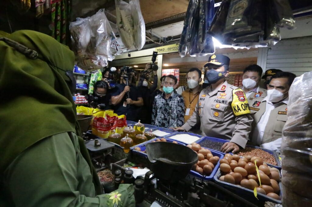 SURABAYA, Kapolda Jawa Timur Irjen Pol Nico Afinta bersama Forkopimda jatim dalam hal ini Gubernur Jatim yang diwakili Kepala Dinas Perindustrian dan Perdagangan Jatim Drajat Irawan, Pangdam V/Brawijaya yang diwakili Dandim Surabaya Selatan Kol Inf Jacob Janes Patty, Kepala Bulog Jatim, Kepala Pasar Wilayah Surabaya, Tim Satgas Pangan Jatim serta Pejabat Utama Polda Jatim dan Kapolrestabes Surabaya, Selasa (22/3/2022) siang melakukan pengecekan ketersediaan minyak goreng kemasan maupun minyak goreng curah di Pasar Wonokromo, Surabaya.
