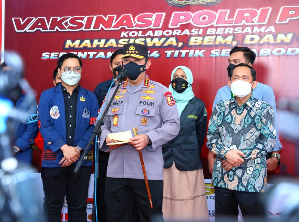 Jakarta – Kapolri Jenderal Listyo Sigit Prabowo meninjau secara langsung kegiatan akselerasi vaksinasi yang diselenggarakan bersama dengan elemen mahasiswa, BEM dan Organisasi Kepemudaan (OKP) di Gelanggang Olahraga Universitas Trisakti, Jakarta, Selasa (29/3/2022).