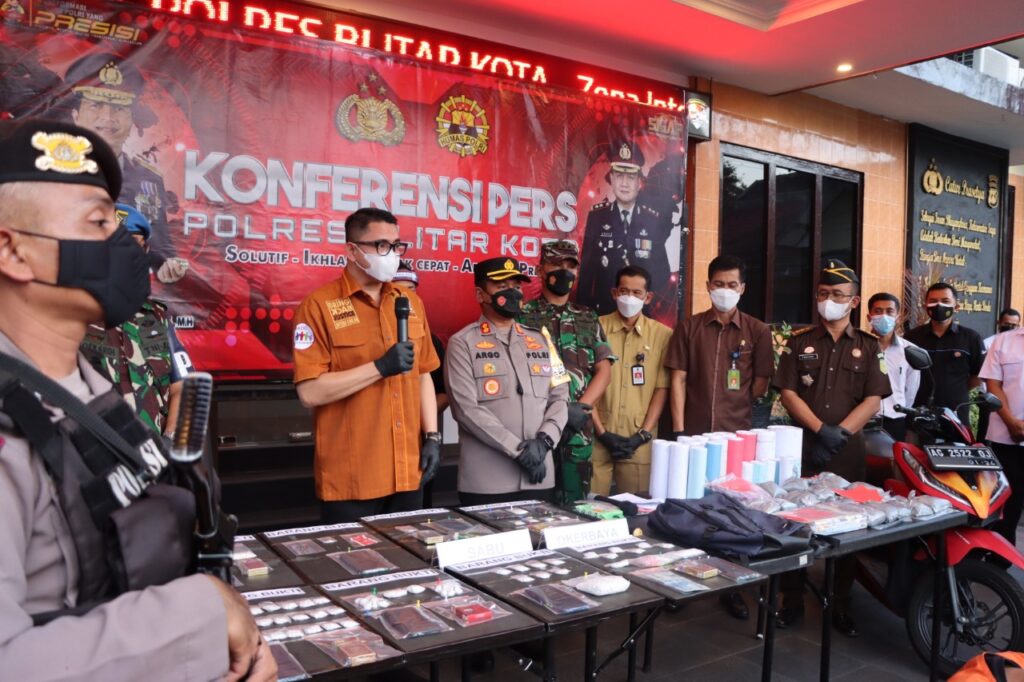 Anggota Komisi III DPR RI Arteria Dahlan yang turut hadir dalam konferensi pers, memberikan apresiasi Kinerja Polres Blitar Kota dibawah Kepemimpinan AKBP Argowiyono yang berhasil mengungkap kasus narkoba jenis sabu, Double L, Miras dan Petasan di wilayahnya.