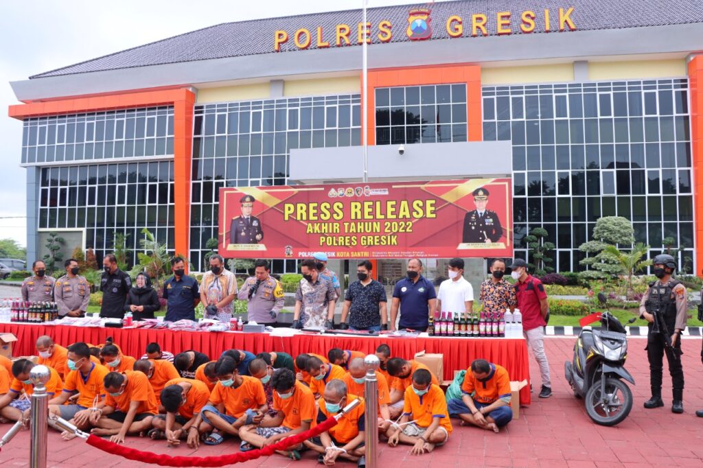 Gresik – Pada penghujung tahun 2022, Polres Gresik menggelar press release di halaman Mapolres Gresik, Jumat 30 Desember 2022. Dipimpin langsung oleh Kapolres AKBP Mochamad Nur Azis disampaikan dihadapan awak media, sejumlah pengungkapan kasus, capaian, hingga tingkat penyelesaian kasus yang ditangani.