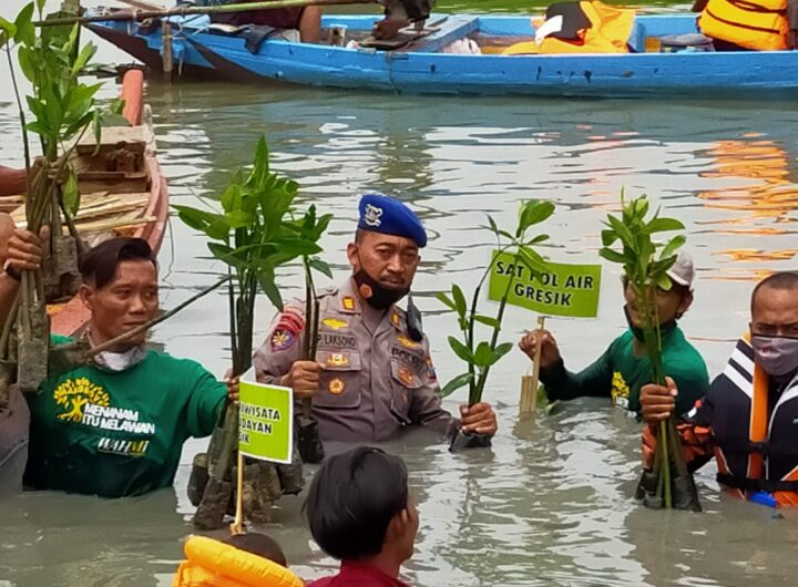GRESIK – Polairud melakukan kegiatan penanaman pohon Mangrove di Wilayah pesisir yang berada di Desa Karang Kiring...