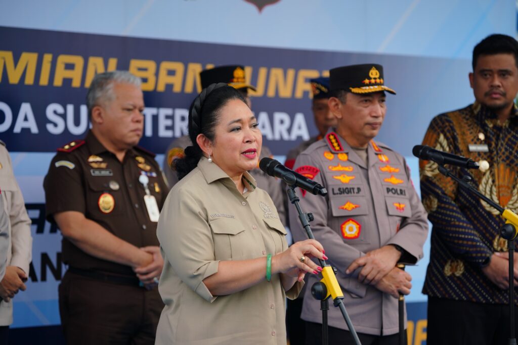 SUMUT – Ketua Komisi IV DPR, Siti Hediati Hariyadi atau Titek Soeharto menghadiri pelepasan bantuan kemanusiaan Polri sebanyak 22 kontainer untuk didistribusikan kepada korban bencana alam di Aceh, Sumatra Utara, dan Sumatra Barat.